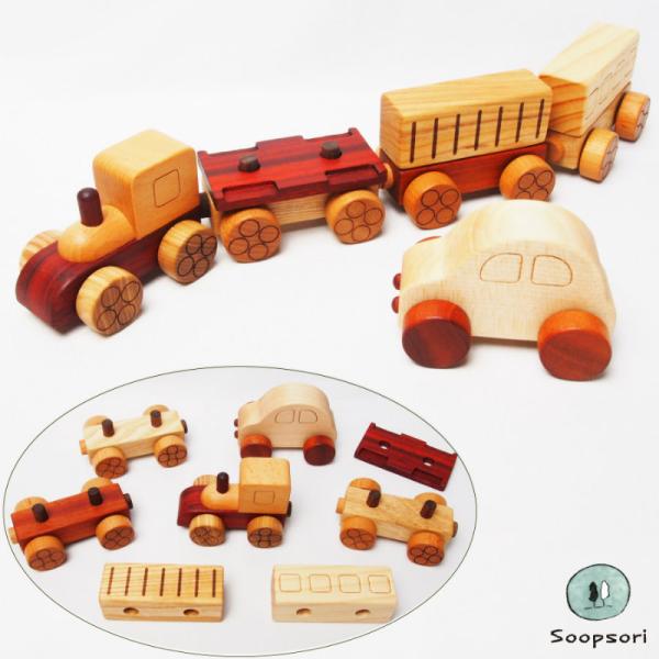 木のおもちゃ のりものいっぱいセット 磁石連結 汽車 ミニカー3個入り 木のおもちゃ 知育玩具 1歳 1歳半 男の子 女の子 誕生日 ギフト 機関車 貨物車 トレーラー 乗用車 木のおもちゃと子ども家具スプソリ